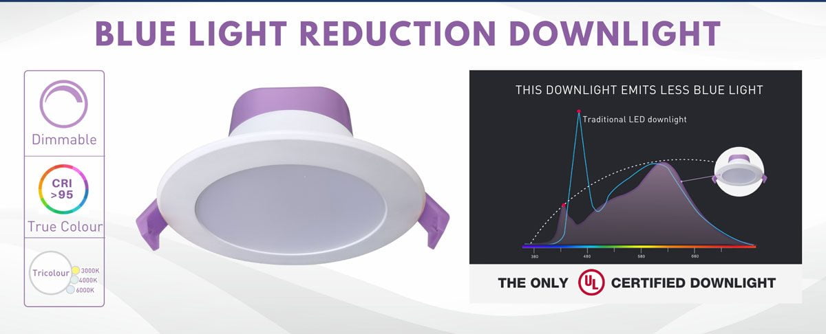 These blue light reduction LED Downlights reduce the blue light output by more than 50% and by emitting a true daylight colour of CRI>95, this means on a scale of 1-100 the lights rate at 97.